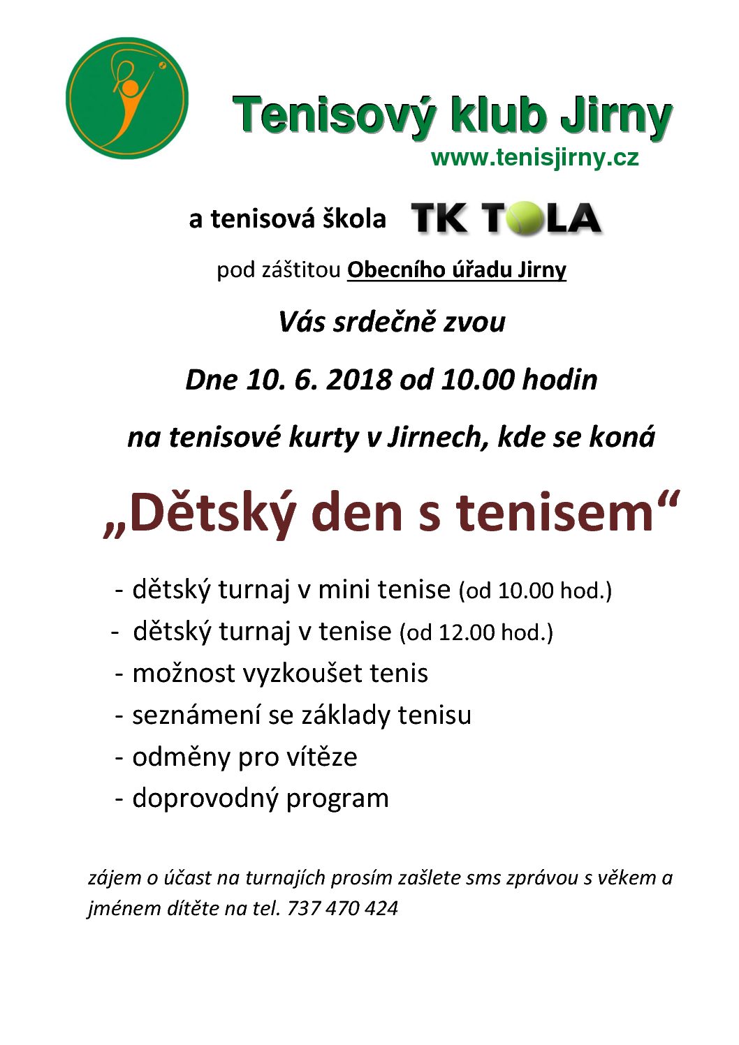 I v letošním roce proběhne ve spolupráci s TK TOLA a pod záštitou Obecního úřadu Jirny Dětský den s tenisem. Přijďte začít tenisovou kariéru Vašich ratolestí na kurty Tenisového klubu Jirny v sobotu 1.6. od 10 hod. Bližší informace naleznete v přiloženém posteru (nutno kliknout na příspěvek).